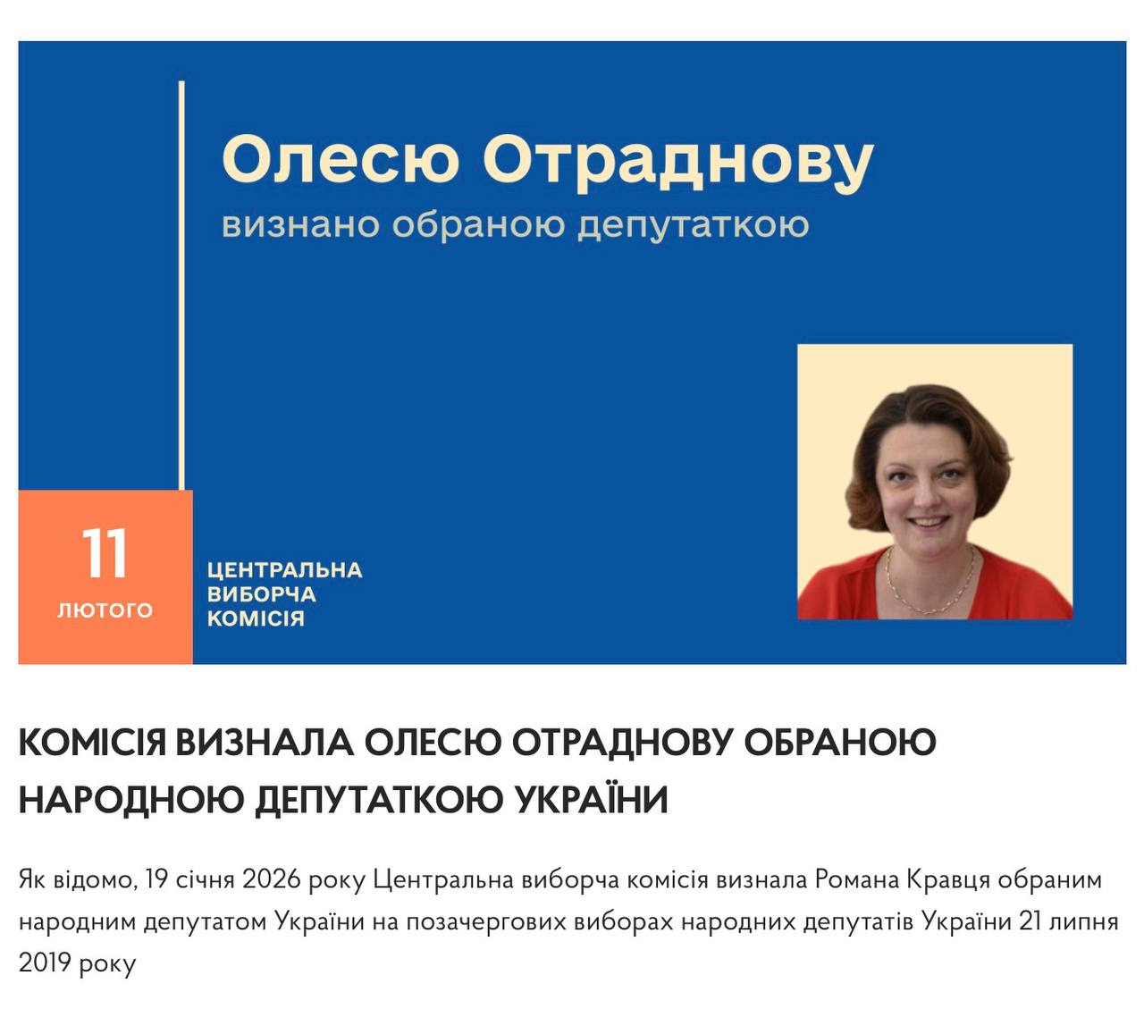 ️ЦВК визнало новою народною депутаткою «Слуг народу» Олесю Отраднову
