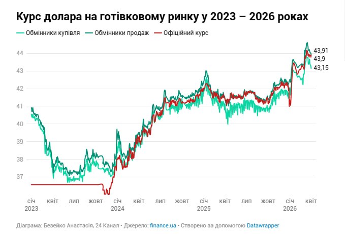 Станом на ранок 1 квітня готівковий ринок утримував вищі значення долара: у банках продаж — ≈44,14 грн, на чорному ринку — ≈43,9 грн, в обмінниках — до 44,01 грн.