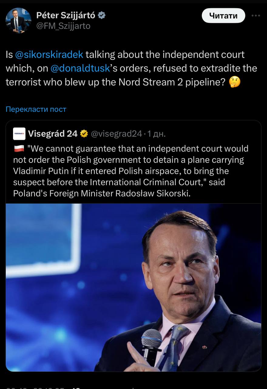 Очільник МЗС Польщі побажав “Мадяру” добити нафтопровід “Дружба” Сікорський у соцмережі X, відповідаючи своєму угорському колезі Петеру Сіярто на його допис про польський суд, який нібито під тиском Туска відмовив в екстрадиції українця, якого Німеччина підозрює в підриві «Північних потоків», заявив: «Петере, я пишаюся польським судом, який постановив, що саботаж проти загарбника не є злочином. Ба більше, я сподіваюся, що вашому хороброму співвітчизнику, майору Мадяру, нарешті вдасться вивести з ладу нафтопровід, який живить військову машину Путіна, і ви отримуватимете свою нафту через Хорватію».