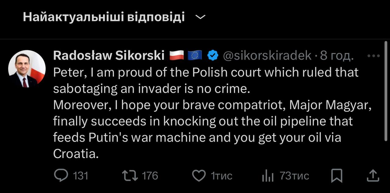 Очільник МЗС Польщі побажав “Мадяру” добити нафтопровід “Дружба” Сікорський у соцмережі X, відповідаючи своєму угорському колезі Петеру Сіярто на його допис про польський суд, який нібито під тиском Туска відмовив в екстрадиції українця, якого Німеччина підозрює в підриві «Північних потоків», заявив: «Петере, я пишаюся польським судом, який постановив, що саботаж проти загарбника не є злочином. Ба більше, я сподіваюся, що вашому хороброму співвітчизнику, майору Мадяру, нарешті вдасться вивести з ладу нафтопровід, який живить військову машину Путіна, і ви отримуватимете свою нафту через Хорватію».