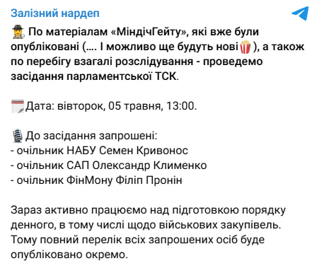 ️”До засідання запрошені: очільник НАБУ Семен Кривонос, голова САП Олександр Клименко та керівник Фін Мону Філіп Пронін. Повний перелік запрошених осіб буде опубліковано окремо”, — повідомив Ярослав Железняк.