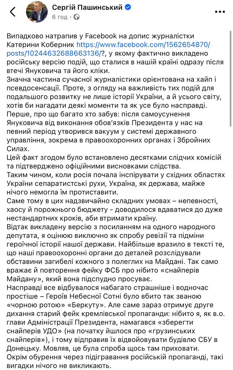 Сергій Пашинський звинувачує її у «хайпі та псевдосенсації», а ще у викладенні «російської версії подій» в Україні після втечі Януковича.