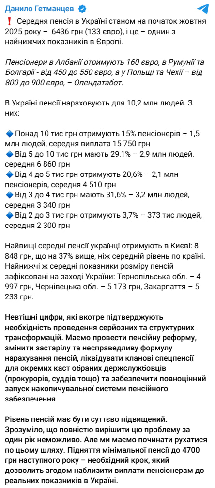 Гетманцев згадав про пенсіонерів, бо вибори близько? Середня пенсія в Україні — 133 євро, одна з найнижчих у Європі: Гетманцев заявив про реформу й скасування спецпенсій Станом на початок жовтня 2025 року середня пенсія в Україні становить 6 436 грн (приблизно 133 євро), повідомив голова Комітету ВРУ з питань фінансів, податкової та митної політики Данило Гетманцев. В Україні пенсії отримують 10,2 млн осіб. Із них лише 15% (1,5 млн) отримують понад 10 000 грн, середня виплата становить 15 750 грн. Близько 29% отримують 5–10 тис. грн, а майже третина пенсіонерів має менше 4 тис. грн на місяць. Фінальні думки Гетманцева виглядають як передвиборчий лозунг: “Маємо провести пенсійну реформу, змінити застарілу та несправедливу формулу нарахування пенсій, ліквідувати кланові спецпенсії”. Раніше на каналі, кандидати готуються до виборів, кампанія ще формально не стартувала, але робота про Києву та області вже йде.