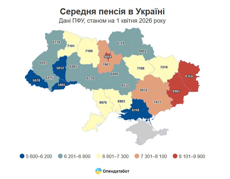 Найвищі пенсії в Україні зафіксовані у Києві — в середньому 9 864 грн, тоді як найнижчі — на Тернопільщині, де виплати становлять 5 612 грн.