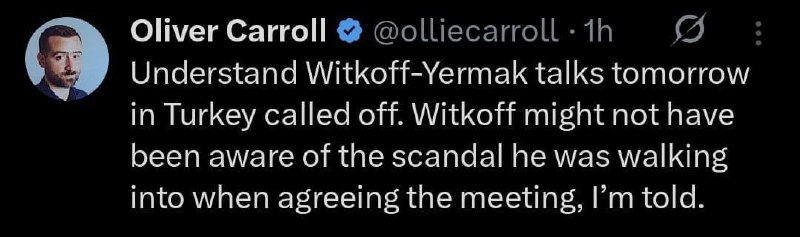 Заплановані на завтра в Туреччині переговори між Віткоффом та Єрмаком скасовано – журналіст the Economist Олівер Керрол.