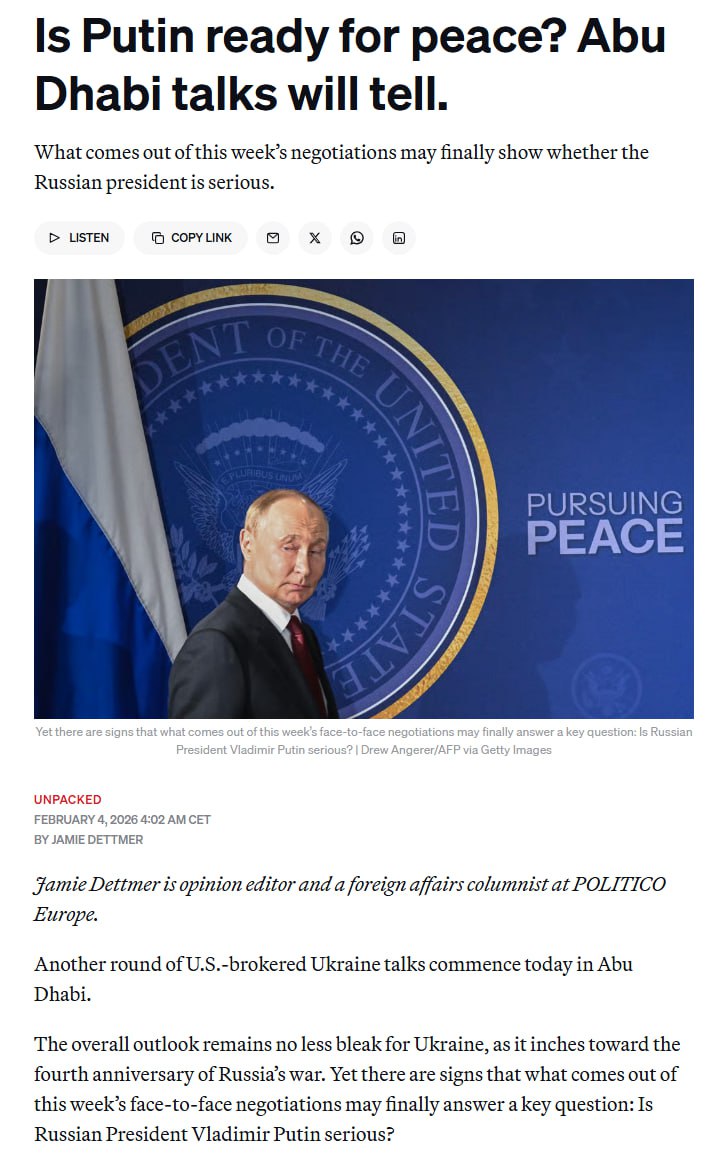 Переговори США–Україна–РФ в Абу-Дабі можуть бути більш багатообіцяючими, ніж очікувалося, і створюють шанс завершити війну навесні — Politico