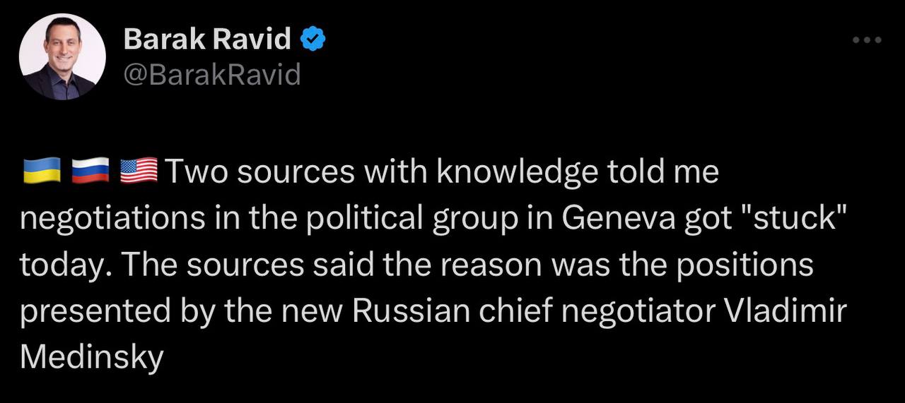 Переговори в політичній групі в Женеві сьогодні «застрягли». Причиною стали позиції, представлені новим головним переговірником Росії Володимиром Мединським – журналіст Axios Барак Равід з посиланням джерела.