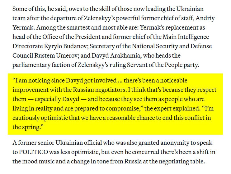 Експерт із зовнішньої політики, який консультував Київ, сказав Politico, що участь Давида Арахамії у переговорах призвела до помітних змін на краще. За його словами, російська сторона стала серйозніше ставитися до переговорного процесу.