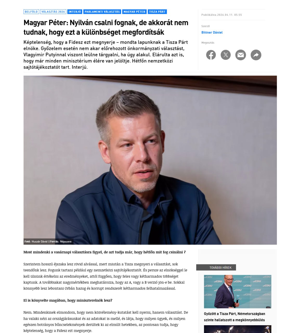 Лідер партії-перемолжня парламентских виборів Tisza Петер Мадьяр в інтерв’ю Népszava заявив, що в разі потреби вестиме переговори з президентом РФ Володимиром Путіним: “Звісно, якщо так складеться, доведеться сісти за стіл переговорів із російським президентом”.