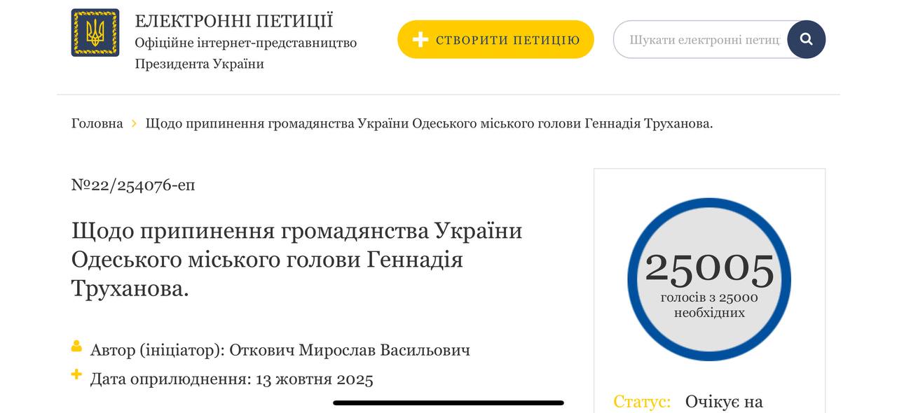 ️Петиція щодо позбавлення мера Одеси Труханова українського громадянства набрала необхідну кількість голосів, – тепер її має розглянути президент. Цікаво, що потрібних 25 тисяч підписів зібралось буквально за кілька годин.