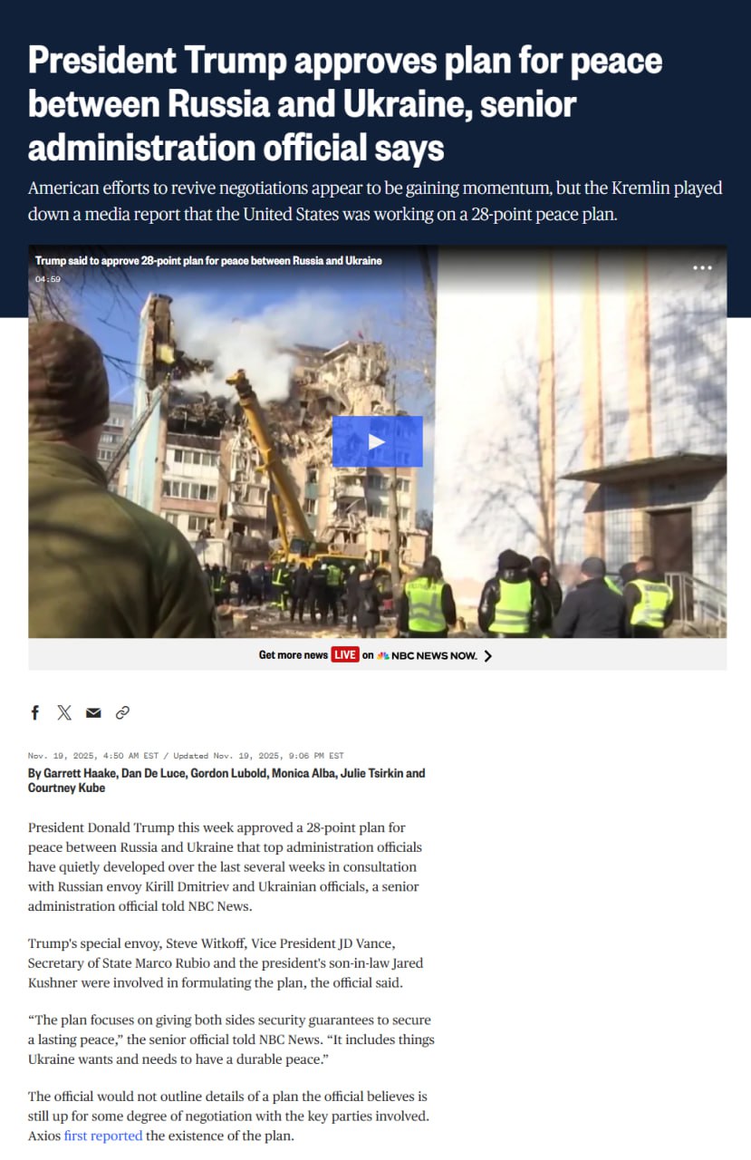 Президент США Дональд Трамп цього тижня затвердив 28-пунктний план припинення війни між Росією та Україною, повідомив високопоставлений представник адміністрації NBC News. За його словами, документ розробляли протягом кількох тижнів за участі російського спецпредставника Кіріла Дмітрієва та українських посадовців.