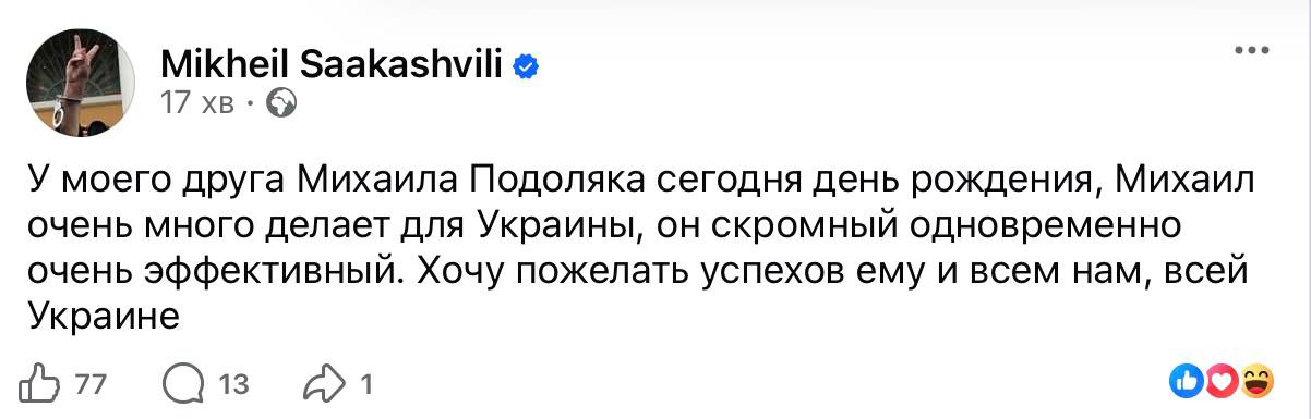 Саме Подоляк один з тих, хто формував тексти, які потім зʼявлялися в дописах на сторінці Міхеїла Саакашвілі у Facebook. Незважаючи на продовження впливу Єрмака, що залишає Подоляка в ОП, той не певен в своєму майбутньому і намагається хоч якось показати свою важливість. Зокрема от такими «дописами від Саакашвілі».