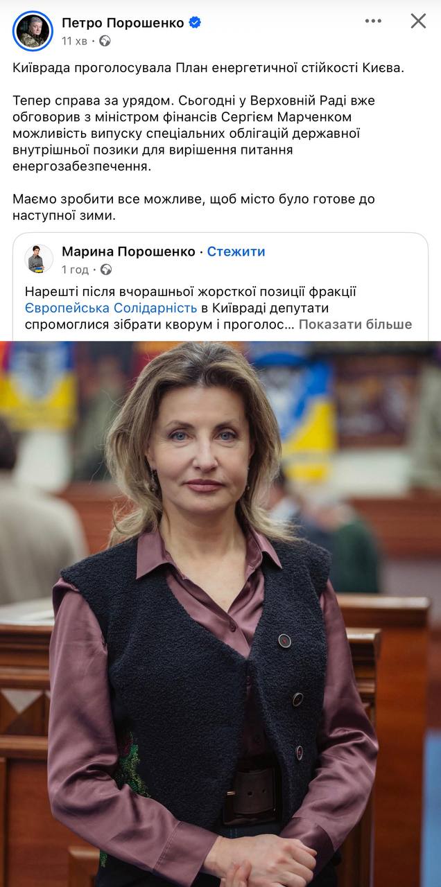 ️Тим часом, подружжя Порошенків намагається забрати собі всі лаври за ухвалений КМДА план енергостійкості