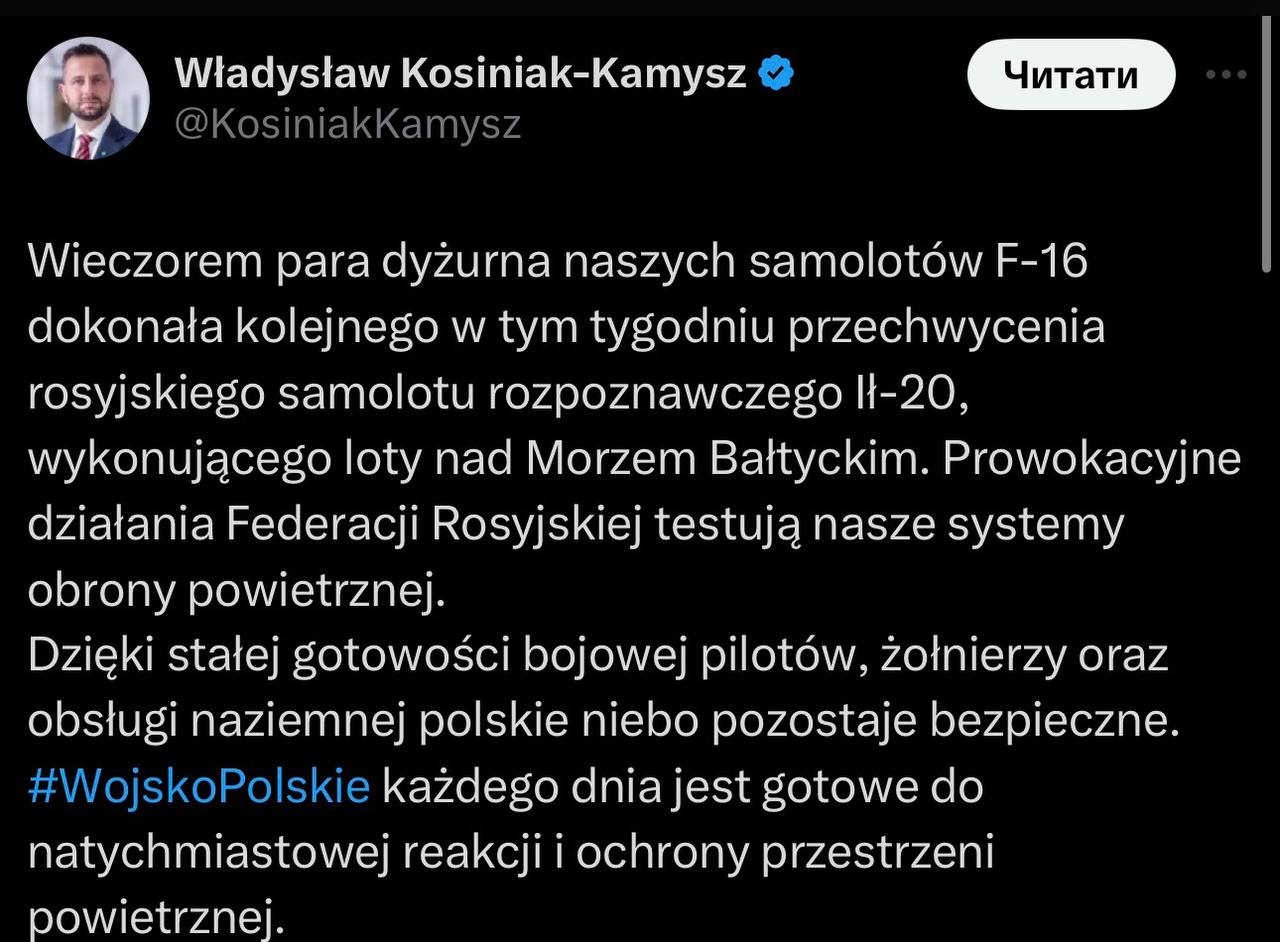 За словами міністр національної оборони Польщі Владислава Косіняка-Камиша, це провокаційні дії Росії для випробування систем протиповітряної оборони Польщі.