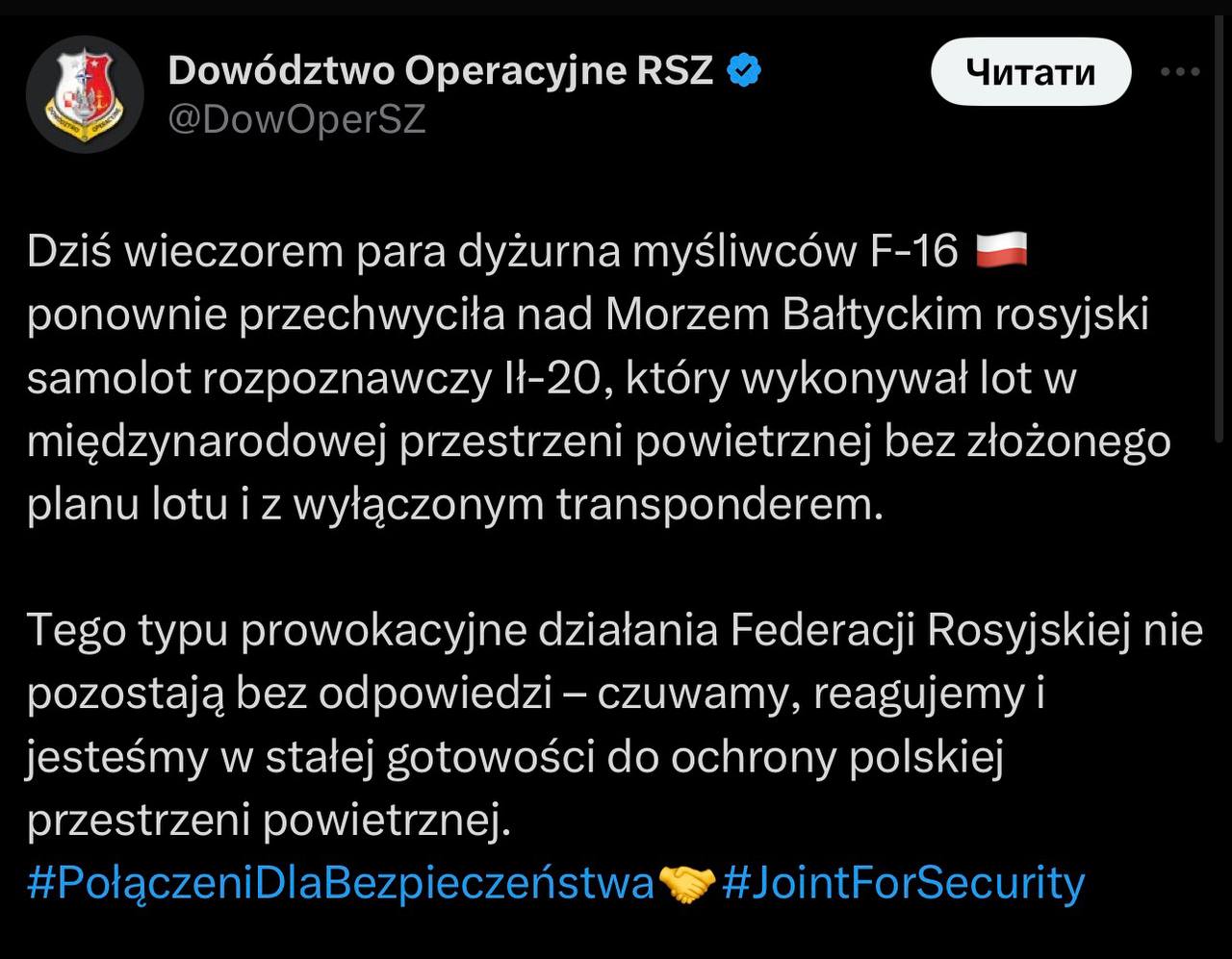 У польських Збройних силах зауважили, що російський літак перебував у міжнародному повітряному просторі без поданого плану польоту та з вимкненим транспондером.