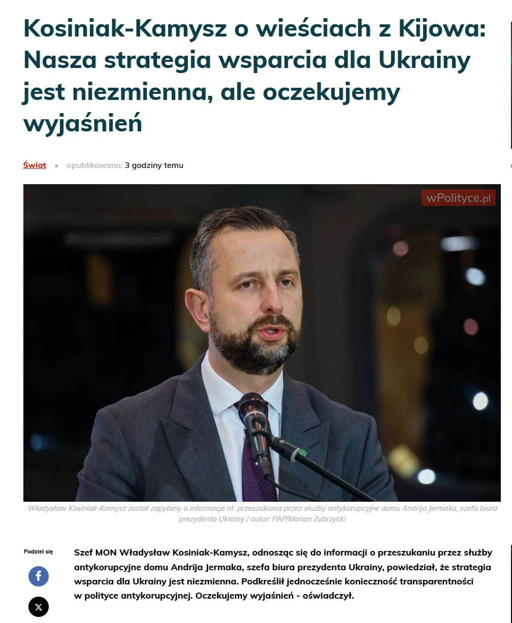 Міністр оборони Польщі Владислав Косіняк-Камиш, коментуючи обшуки НАБУ і САП у домі керівника Офісу президента Андрія Єрмака, заявив, що стратегія підтримки України лишається незмінною, але Варшава очікує офіційних роз’яснень. Він підкреслив: “Ми очікуємо пояснень”.