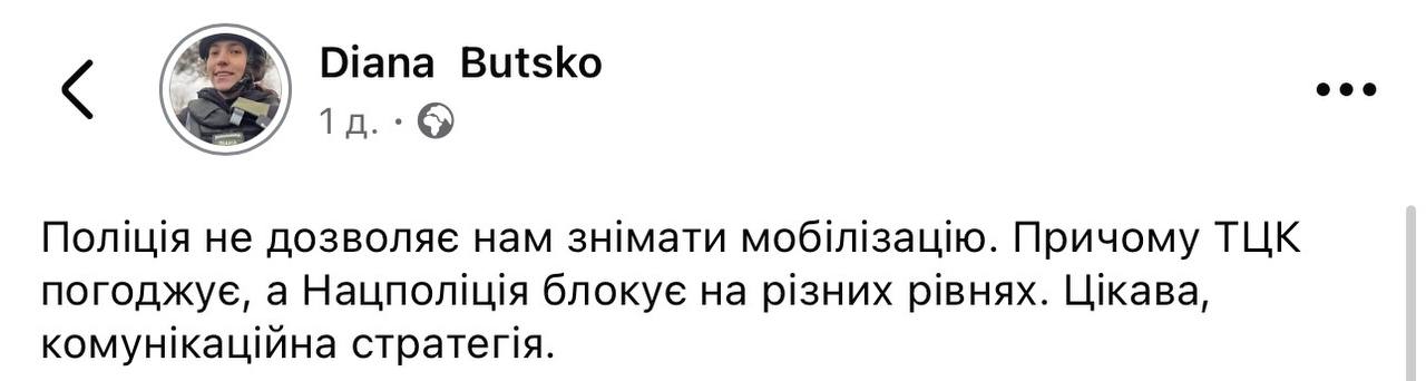 При чому і журналістка Діана Буцко, і журналіст Денис Булавін заявляють, що з самими ТЦК проблем немає, вони погоджують зйомку, все блокується на рівні поліції.