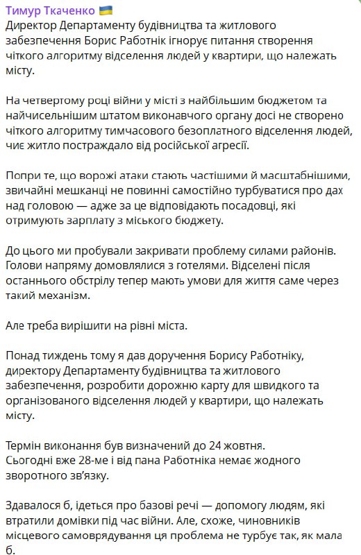 Ще один посадовець КМДА, якому дісталося від Ткаченка – Директор Департаменту будівництва та житлового забезпечення Борис Работнік До нього претензія, що не організував відселення мешканців постраждалих внаслідок атак РФ будинків. Що цікаво, Работнік входить до сфери впливу ще одного старожили КМДА – В'ячеслава Непопа. Його Ткаченко чомусь у своєму пості не згадав
