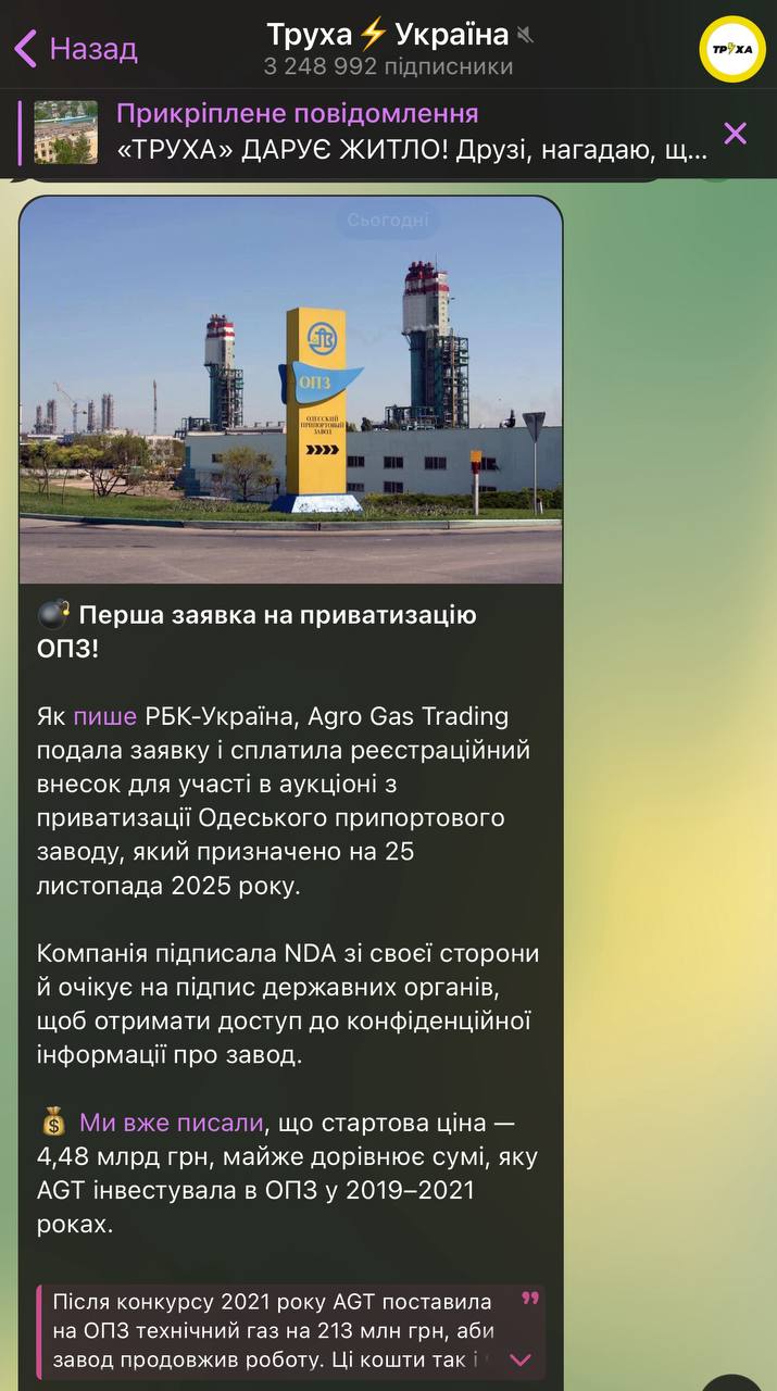 Почалася боротьба за контроль над ОПЗ – викупити підприємство прагне компанія AGT, яка раніше заробляла на заводі завдяки «даху» у ФДМУ. Agro Gas Trading, створена у 2017 році зі статутним капіталом 1000 грн, фігурувала у розслідуваннях НАБУ щодо схем на ОПЗ. І саме через давальницьку угоду між ОПЗ і AGT держава втратила понад 10 млрд грн. Попри все, компанія зараз намагається «відбілитись» через публікації в «РБК-Україна» та тг-каналі «Труха». В інтерв’ю власники AGT Олександр Горбенко та Володимир Колотило розповідають про плани щодо приватизації ОПЗ. AGT входить до «Групи Олександра Горбуненка», до якої ще належать «Автобанк», «Джимфіт», «Голдекс Вендінг» та інші. Сам Горбенко – уродженець Донбасу, у 2023 році втік до Франції. Намагався закріпитися у США. У 2020 році ОПЗ зазнав збитків на понад 1,2 млрд грн, тоді як AGT ймовірно отримала десятки мільйонів доларів прибутку. За даними НАБУ, лише Сенниченко отримав понад $1,3 млн.