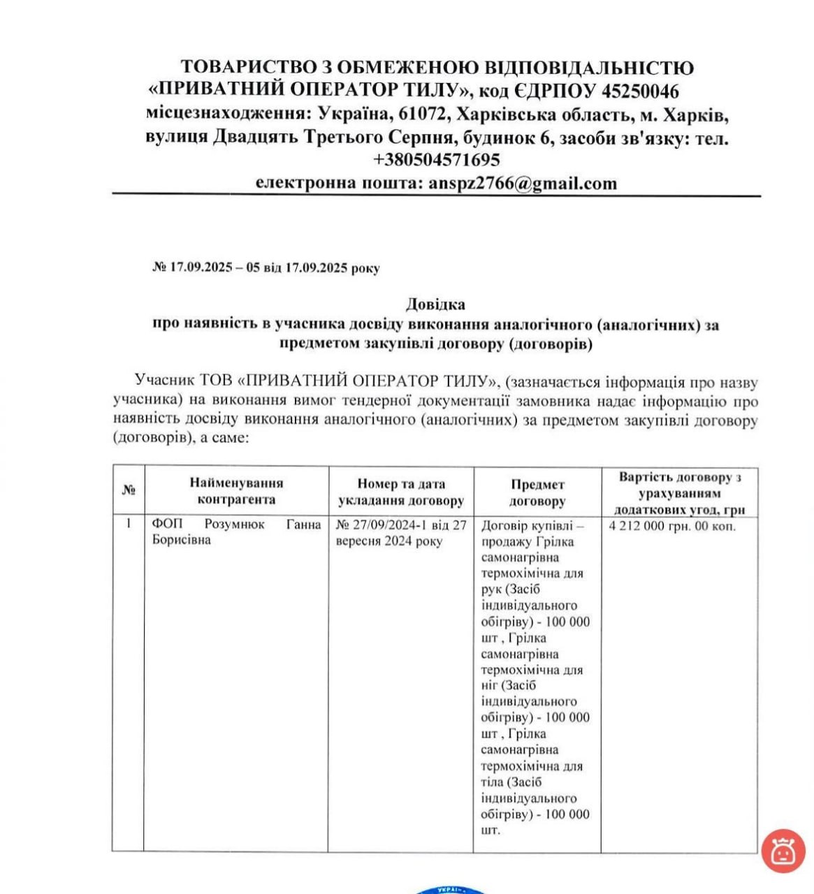 Ніколаєнко описує, що ще на початку минулого року Сили логістики передали потребу на 1,1 млн грілок, але законтрактували лише 600 тисяч. Один із ключових контрактів отримала компанія «Приватний оператор тилу» (зареєстрована у 2024 році, не виробник), яка демпінгувала ціну з 26 до 17,40 грн, але зірвала постачання: з 300 тисяч поставила лише 24 тисячі. Попри це з нею знову уклали угоду — при тому, що на одному з тендерів не прийшов жоден інший постачальник.