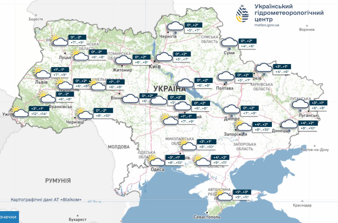️Погода в Україні на сьогодні: хмарно, прохолодно, місцями дощ із мокрим снігом