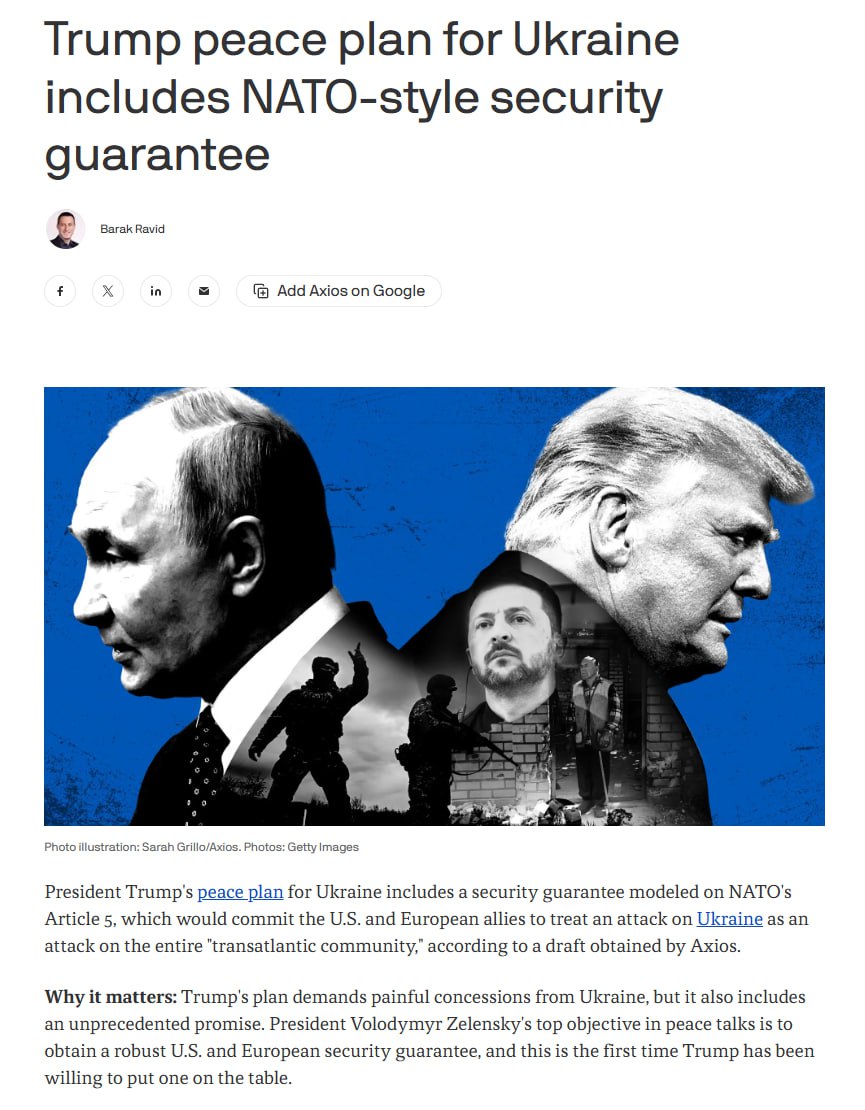 Axios: Проект угоди США, ЄС, НАТО, України та РФ містить гарантію для Києва за моделлю статті 5 НАТО із 10‑річним терміном дії
