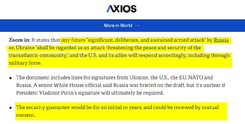 Американське видання Axios пише, що отримало проект угоди між Україною, США, ЄС, НАТО та РФ, який містить механізм колективної відповіді на агресію. Документ передбачає, що будь-яка “значна, навмисна та тривала атака РФ” буде розглядатися як напад на всю трансатлантичну спільноту.
