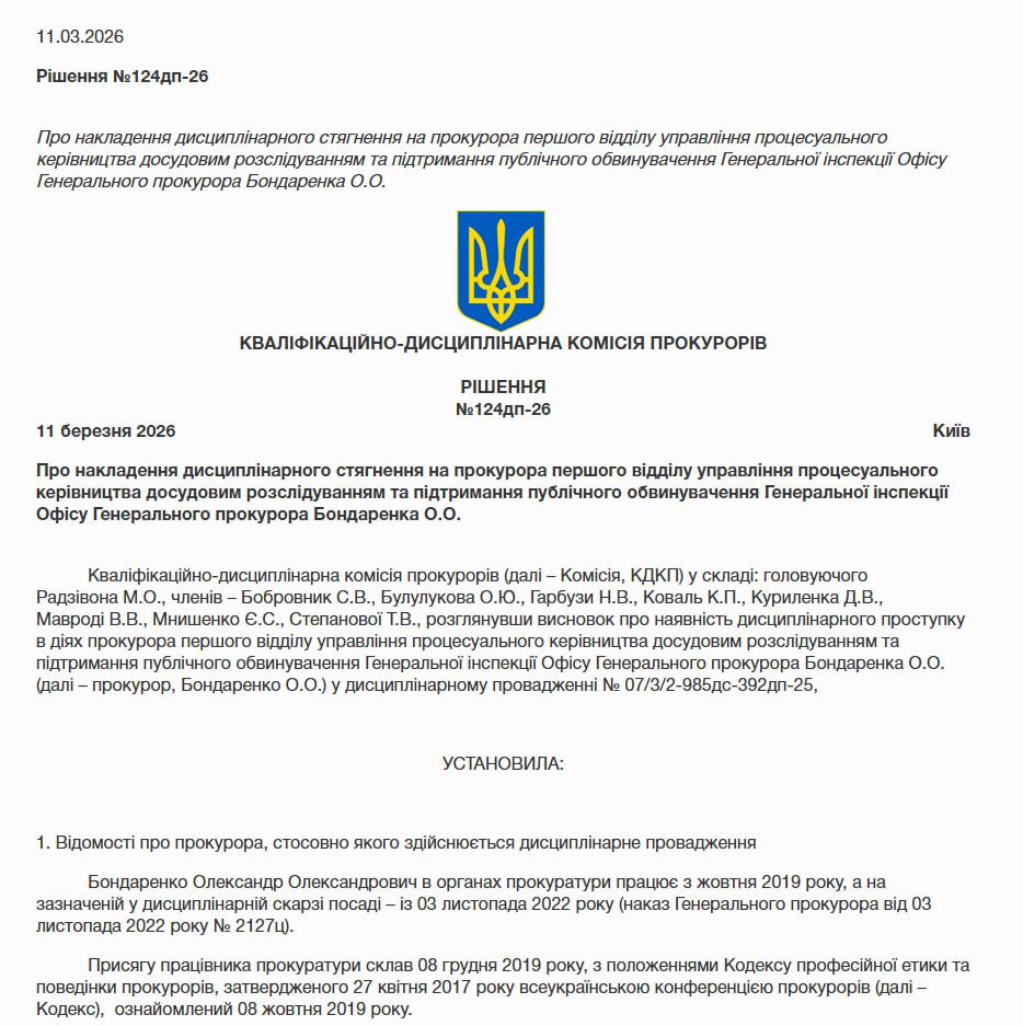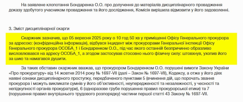 ️️Кваліфікаційно-дисциплінарна комісія прокурорів встановила, що 5 вересня 2025 року в кабінеті Офісу генпрокурора прокурор Олександр Бондаренко “безпричинно образливо висловився”, після чого “схопив його за шию, штовхнув і намагався душити”. Потерпілий мав “стурбований вигляд, одяг – розхристаний”, однак “видимих ознак тілесних ушкоджень” не було, до поліції він не звертався. Комісія кваліфікувала це як “одноразове грубе порушення правил прокурорської етики”.