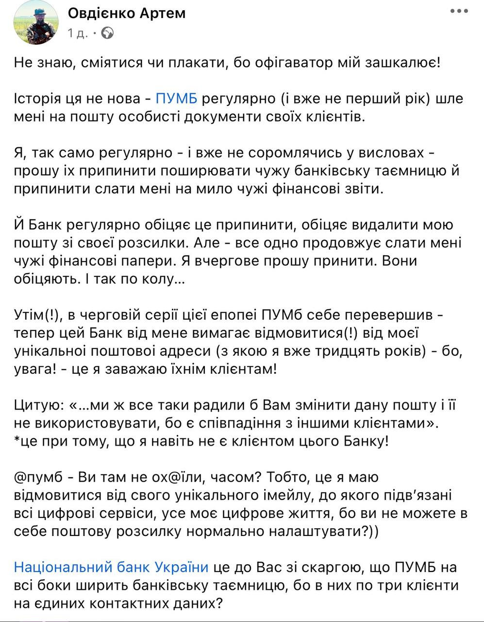 Колишній телеведучий, а нині військовий Артем Овдієнко розповів, що роками отримує чужі документи на свою пошту від банку, при тому, що сам навіть не є клієнтом банку ПУМБ.