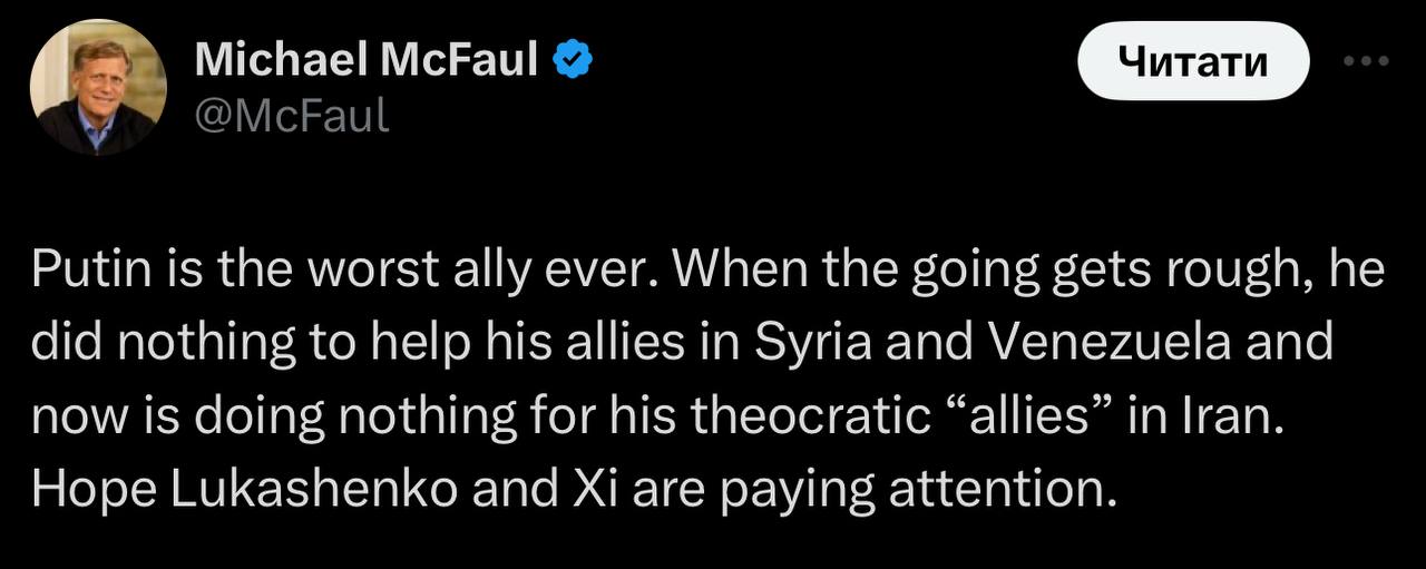 Путін – найгірший союзник у світі. Коли справи йдуть погано, він нічого не робить, щоб допомогти своїм союзникам у Сирії та Венесуелі, а тепер нічого не робить для своїх теократичних «союзників» в Ірані. Сподіваюся, Лукашенко та Сі звертають на це увагу