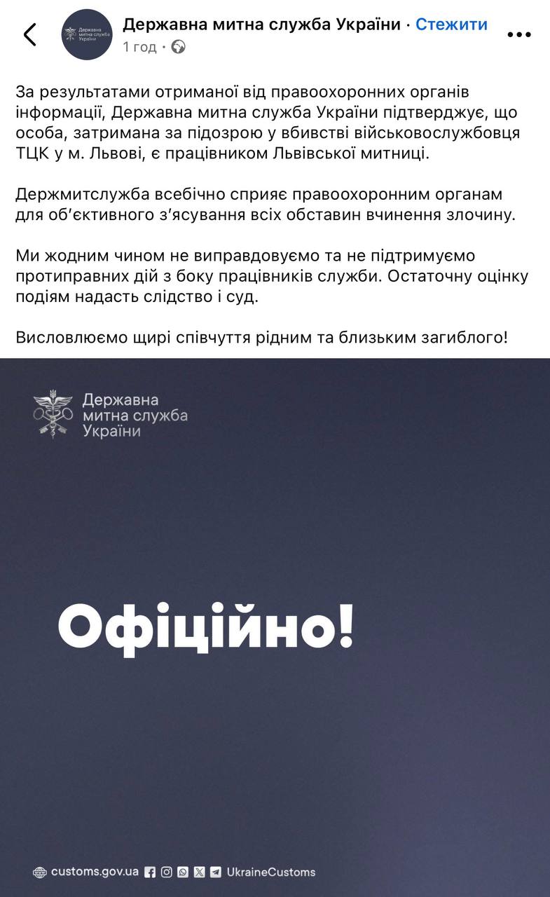 За результатами отриманої від правоохоронних органів інформації, Державна митна служба України підтверджує, що особа, затримана за підозрою у вбивстві військовослужбовця ТЦК у м. Львові, є працівником Львівської митниці,