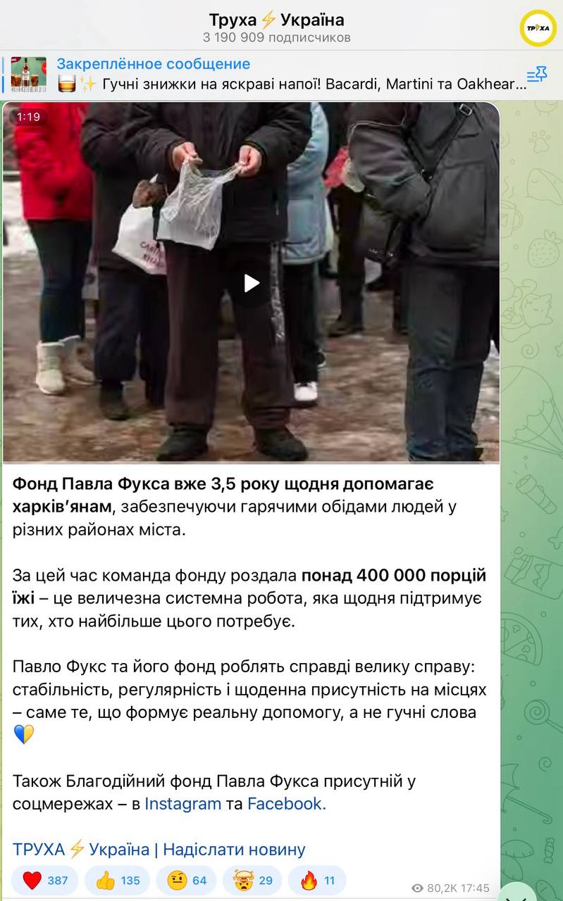 Він витратився, аби розмісти на «Трусі» та у «Джокера» пост про те, як його фонд допомагає їжею харківським пенсіонерам. Щоправда, у фонді навіть не змогли порахувати масштаби допомоги: у відео кажуть про 280 тис. розданих порцій, а в тексті – вже 400 тис. Зазначимо, що останні пару років його фонд у медіа не піарився.