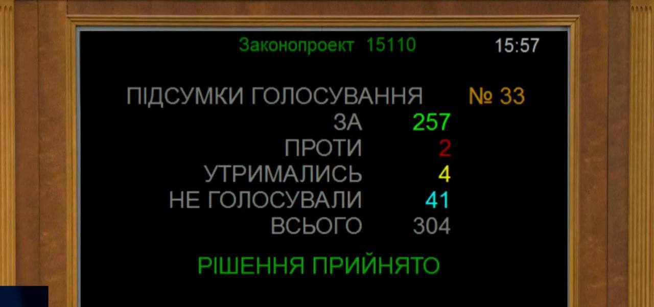 Законопроєкт голосували одразу за основу та в цілому. «За» – 257 голосів.