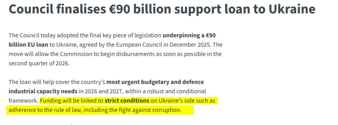 ️‍️Фінальні €90 млрд для України під суворим наглядом Брюсселя: Рада ЄС офіційно затвердила кредит, отримання якого залежатиме від успіхів у боротьбі з корупцією та виконання специфічних маркерів