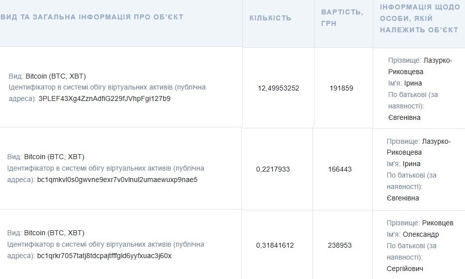 У фрагменті декларації, який поширив блогер Володимир Бондаренко, зазначено криптоактиви у біткоїнах: на Ірину Лазурко-Ріковцеву — 12,49953252 BTC та 0,2217933 BTC, на Олександра Ріковцева — 0,31841612 BTC. Сукупно це становить понад 13 BTC.
