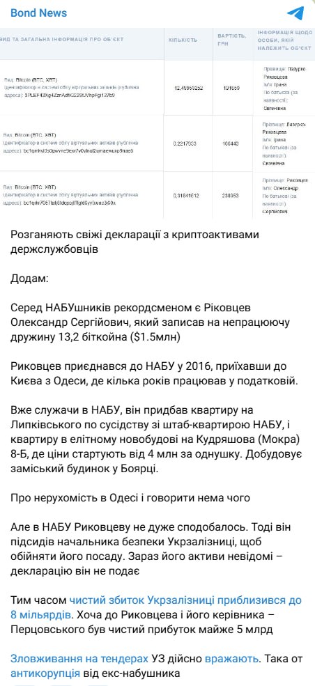 ️️У деклараціях виявили понад 13 BTC у родині ексспівробітника НАБУРіковцева: найбільший обсяг криптоактивів серед пов’язаних фігурантів — блогер Бондаренко