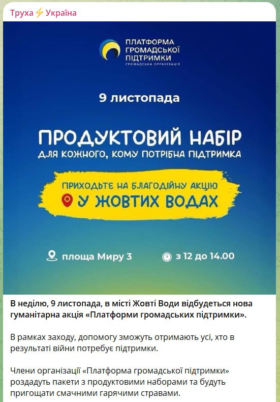 Роздачу продуктових наборів вже рекламують у Telegram Реклама така коштує недешево, особливо у мільйонників, таких як “Труха”. А це підтверджує, що подібні заходи є політичними, про що ми писали раніше. Як ми казали, ГО «Платформа громадської підтримки» зареєстрована за тією ж адресою, що і фірма з орбіти нардепа Віктора Бондаря, підозрюваного у корупції.