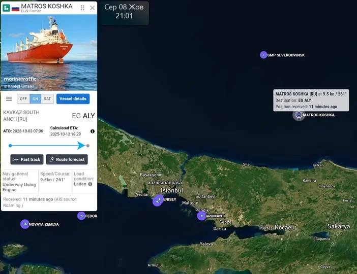 Російське судно MATROS KOSHKA з 3 по 7 жовтня 2025 року вивезло з тимчасово окупованого Криму ще понад 27 тисяч тонн викраденого з Херсонщини та Запоріжжя українського зерна, повідомила журналістка розслідувального проєкту SeaKrime Центру “Миротворець” Катерина Яресько.