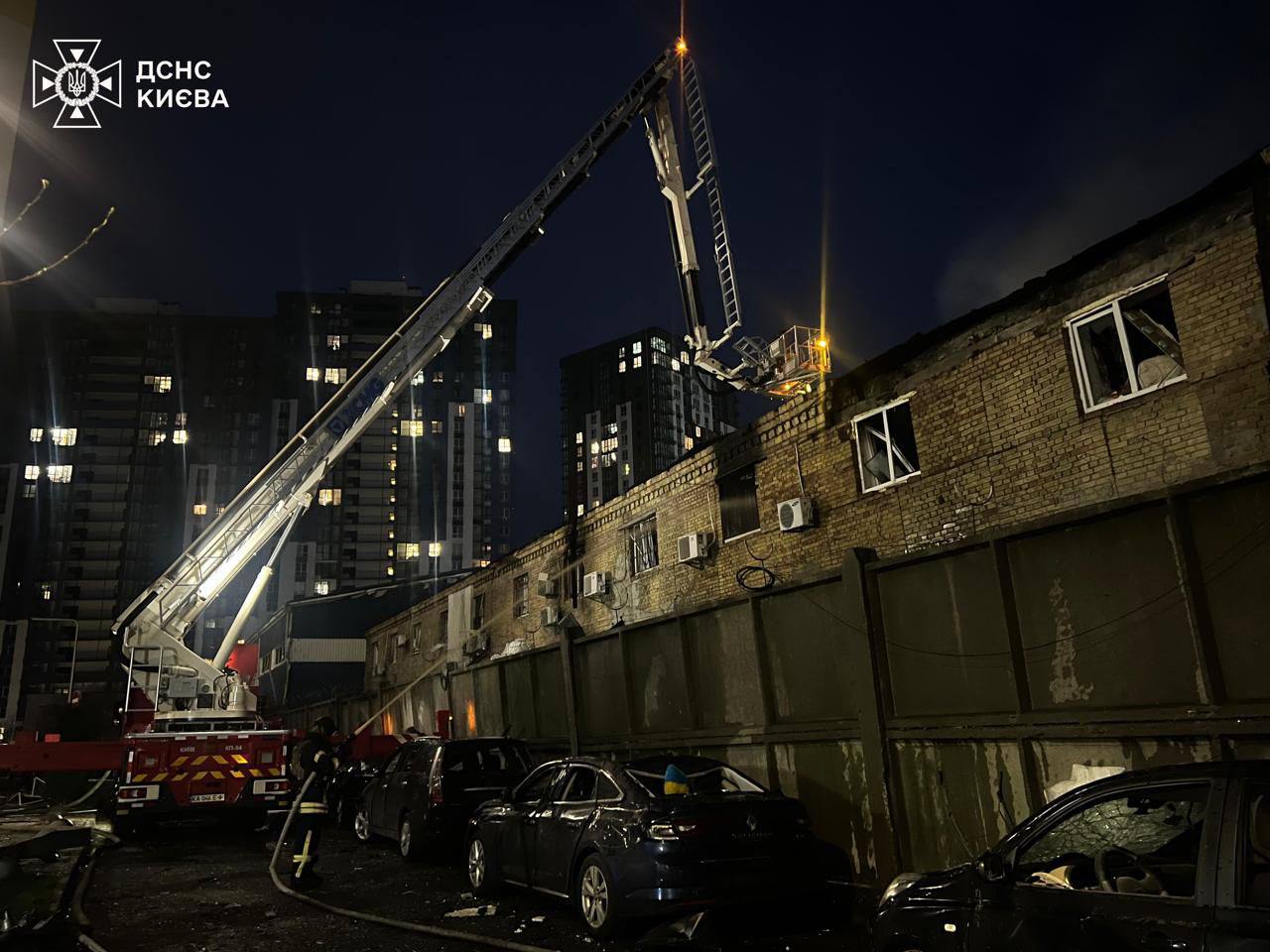 В Оболонському районі пошкоджено офісну будівлю з подальшим горінням та автомобілі. “Внаслідок повторного обстрілу постраждали 4 медики”, повідомив Віталій Кличко.