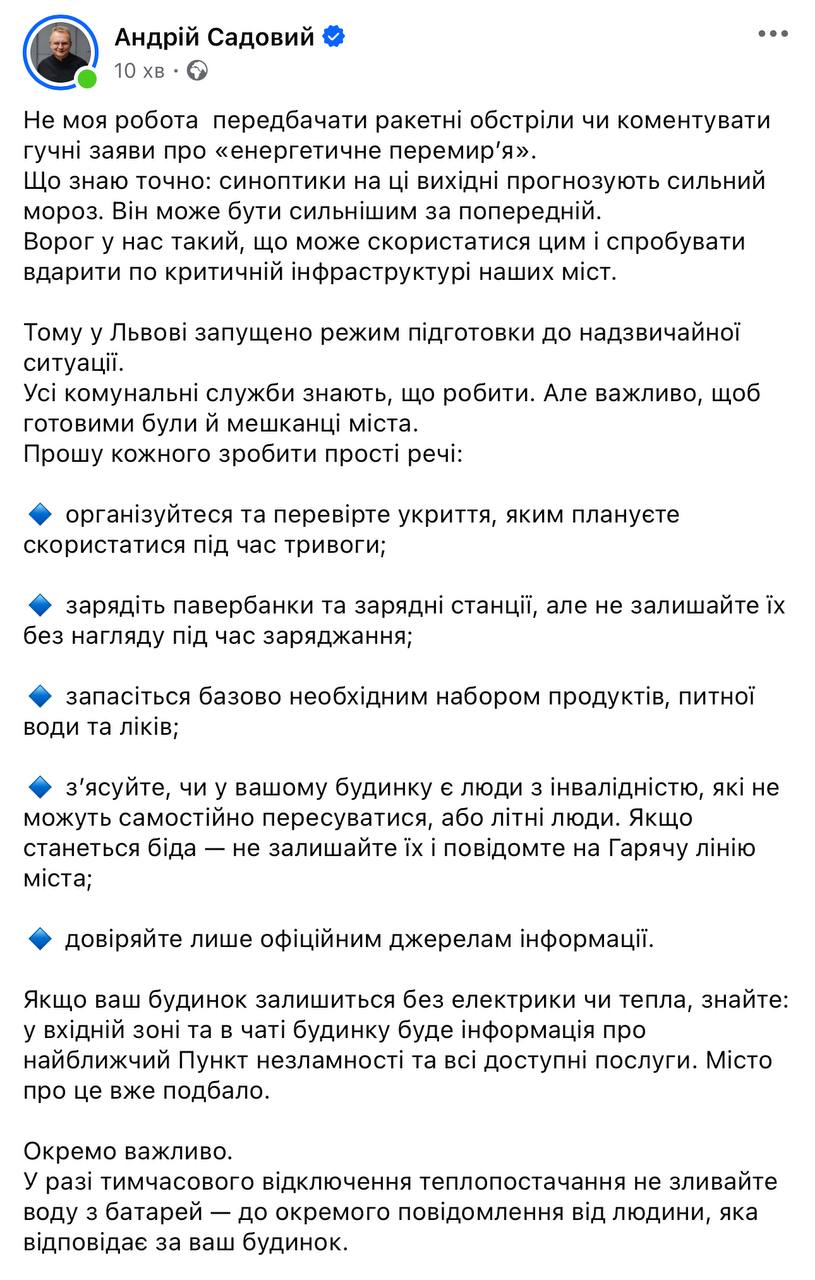 Також мер закликав львівʼян перевірити укриття, зарядити павербенки та зарядні станції, а ще, у разі відключення тепла, злити воду з батарей, а в разі, якщо будинок залишиться без електрики чи тепла, звертатись до пунктів незламності, які забезпечило місто.