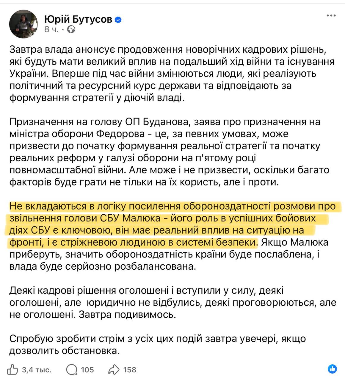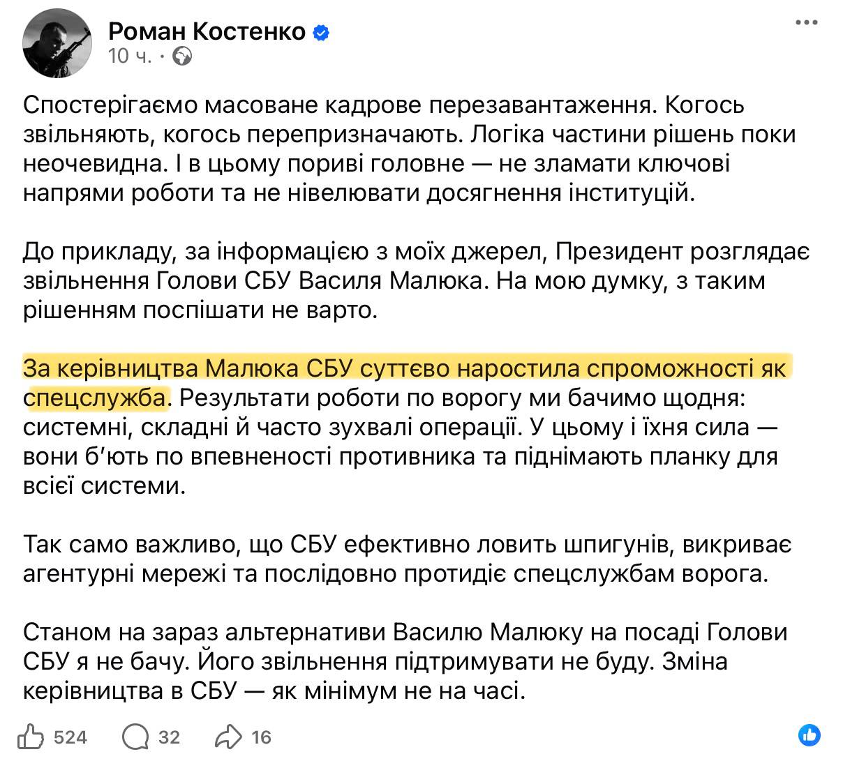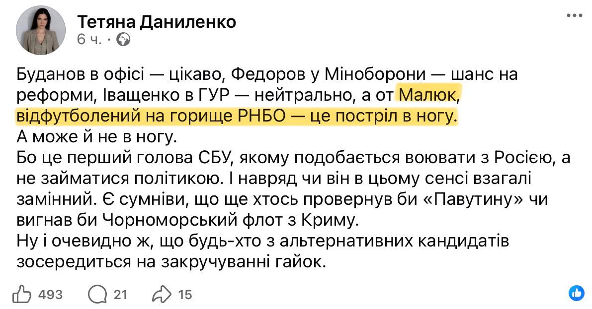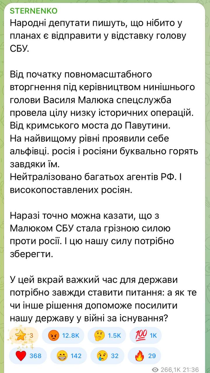 СБУ прокоментувала можливий перехід Малюка У Малюка звечора через суспільну думку орієнтованих на нього та СБУ дають зрозуміти, що його перехід з СБУ — це помилка.