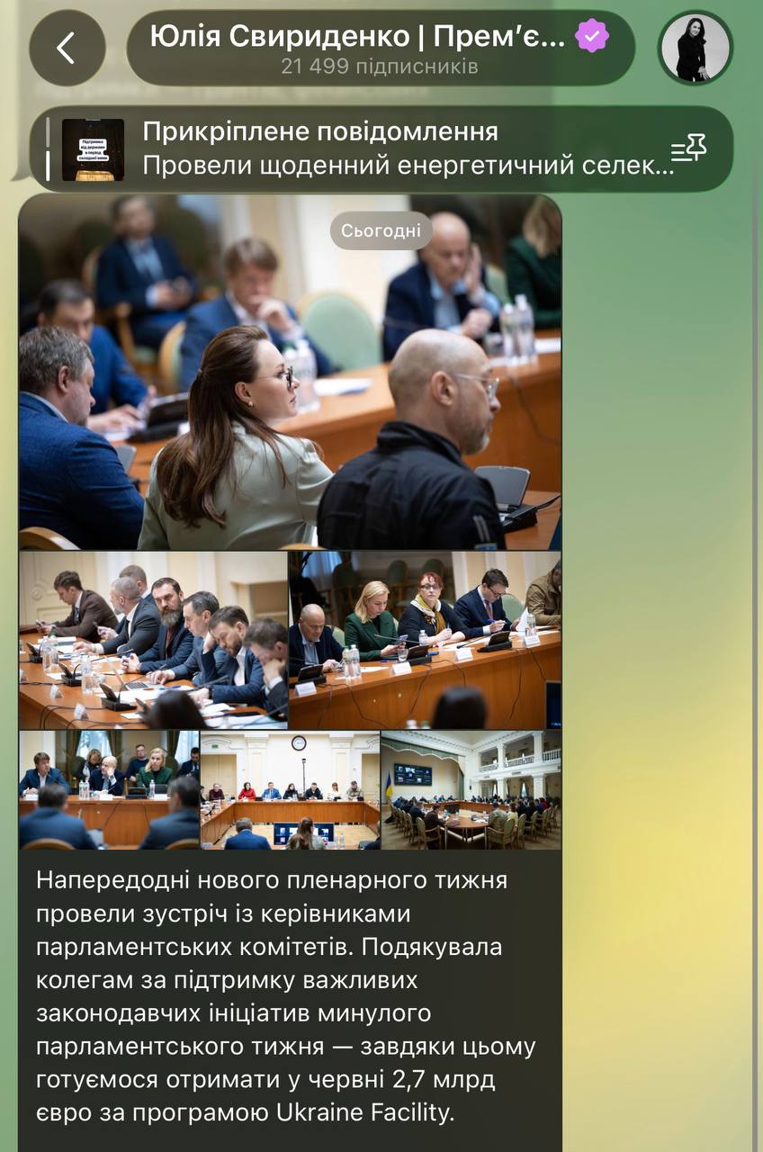 Свириденко відзвітувала про «зустріч із керівниками парламентських комітетів», намагаючись демонструвати плідну роботу з депутатами