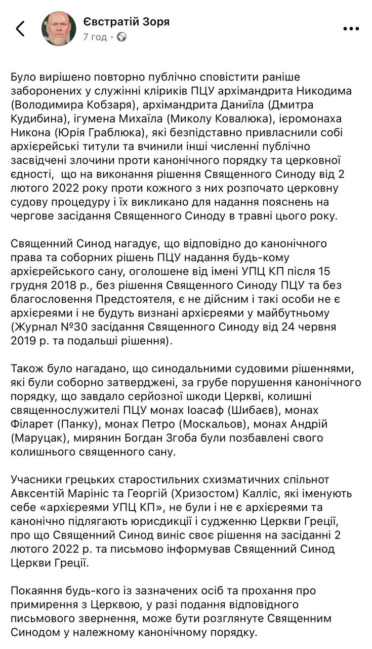 Синод ПЦУ засудив антиканонічну діяльність групи осіб, які самовільно послуговуються назвою Української православної церкви Київського патріархату – офіційно закріпленою за ПЦУ як єдиним правонаступником, заявив Євстратій Зоря.