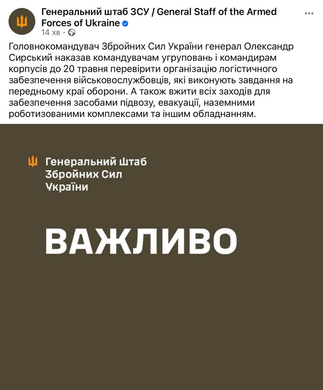 Сирський через добу після скандалу з голодними бійцями 14 ОМБр віддав наказ щодо перевірки логістичного забезпечення військових на передовій