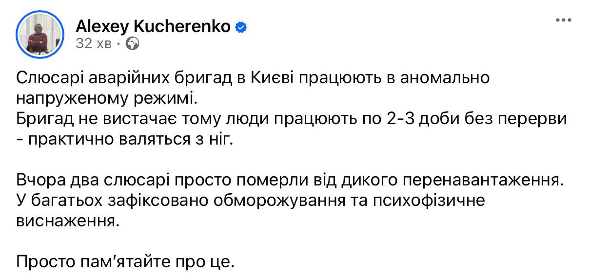 У Києві слюсарі аварійних бригад помирають від перенавантаження – нардеп Кучеренко