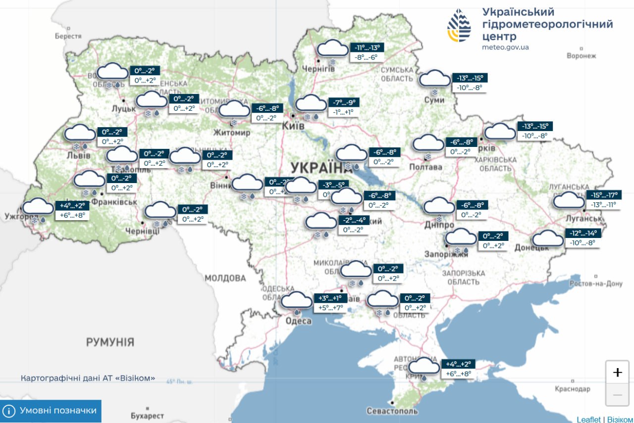 Температура: схід і північний схід — вночі 12–17° морозу, вдень 7–12° морозу; південь, захід і Вінниччина — вночі від 4° морозу️ до 1° тепла, вдень від 2° морозу до 3° тепла; решта території — вночі 5–10° морозу, вдень від 4° морозу до 1° тепла