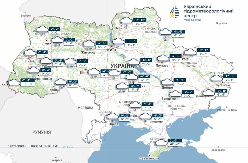 Температура протягом доби 3–8° морозу️; вночі на сході та північному сході 10–15° морозу. У західних і більшості південних областей — від 4° морозу до 1° тепла (удень на Закарпатті та в Криму 6–11° тепла ).
