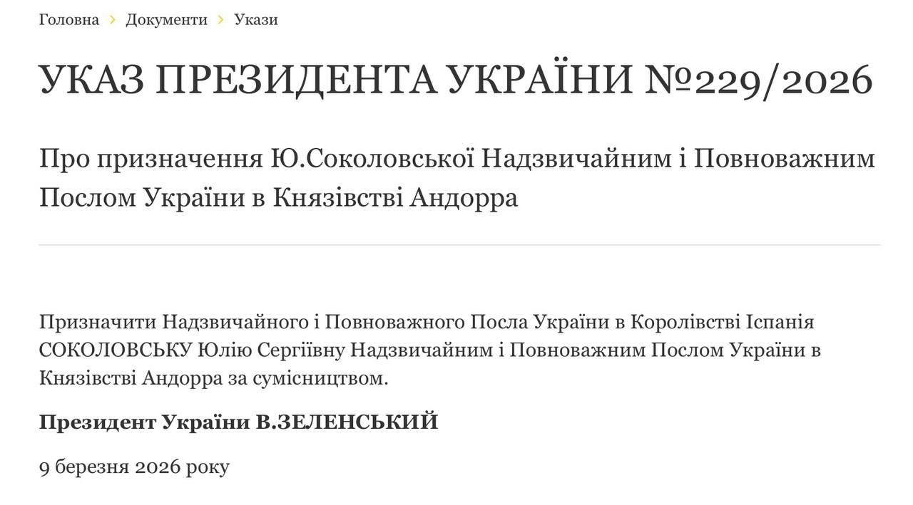 ️Зеленський призначив екс-заступницю Єрмака Юлію Соколовську послом в Андоррі