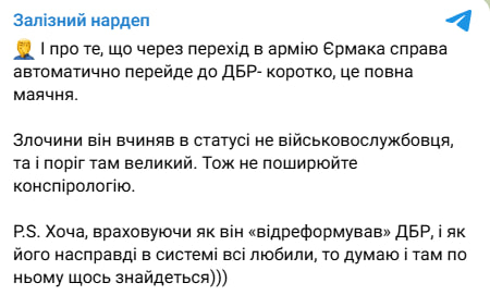 Нардеп Ярослав Железняк заперечив таку інтерпретацію: “І про те, що через перехід в армію Єрмака справа автоматично перейде до ДБР- коротко, це повна маячня. Злочини він вчиняв в статусі не військовослужбовця, та і поріг там великий. Тож не поширюйте конспірологію”.