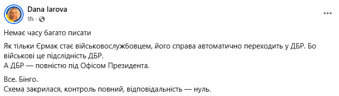 ️️Дана Ярова, яка близька до Сергія Пашинського, написала у Facebook, що після переходу Андрія Єрмака на військову службу його кримінальна справа нібито “автоматично переходить у ДБР”. За її словами: “Бо військові це підслідність ДБР. А ДБР — повністю під Офісом Президента. Все. Бінго. Схема закрилася, контроль повний, відповідальність — нуль”.
